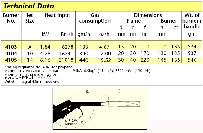 Autotorch brazing burner – No. 4104, High-pressure Regulator – No. 4041, High-pressure hose – 2.75m No.1299.