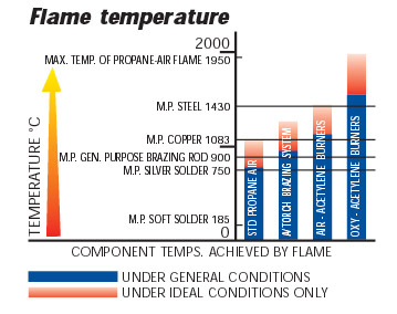 The Bullfinch Auto torch brazing burners can give temperatures up to 950 Degrees Celsius under general conditions and up to 1200 degrees C in ideal conditions only. They can therefore bronze braze under most conditions as well as being able to make faster soft and silver soldered joints (pre-heating will give the best results).